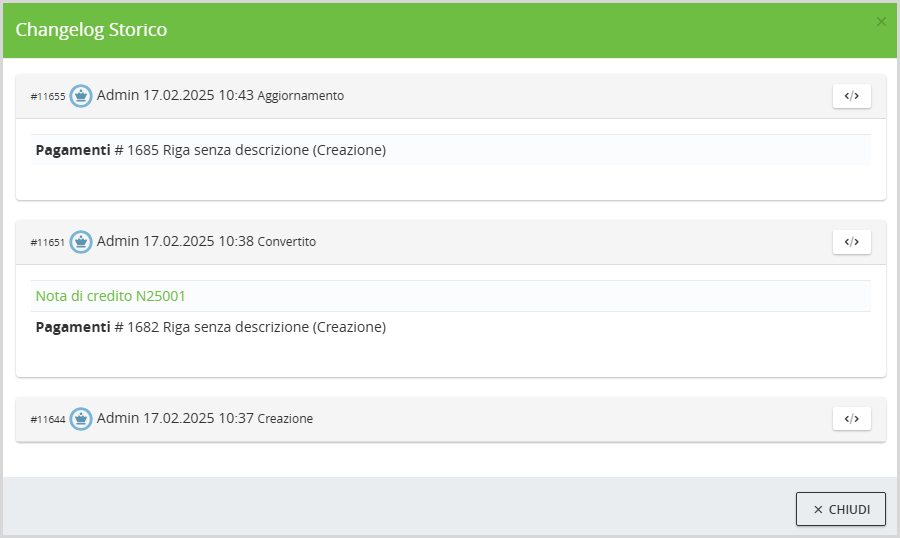 Cliccando sul bottone, si apre una finestra con lo storico delle modifiche: