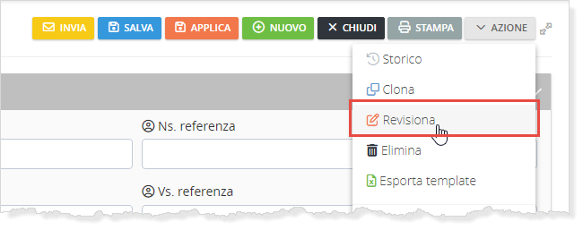 L'operazione per creare una revisione è presente nel menu AZIONE: