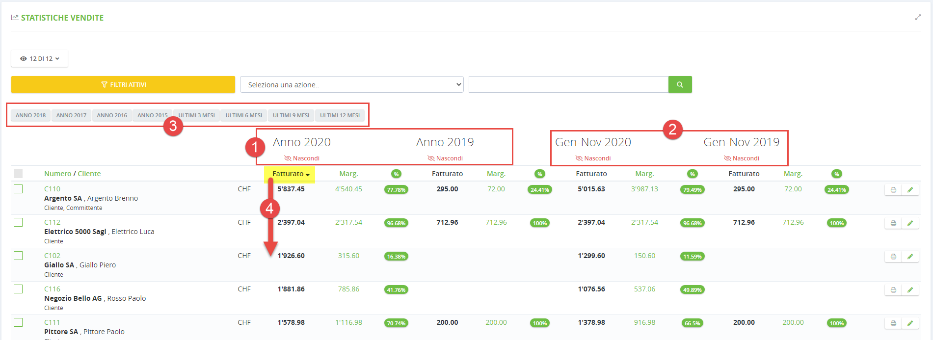 Per vedere il fatturato dei clienti per un periodo, ci sono le statistiche presenti nel modulo Contatto.