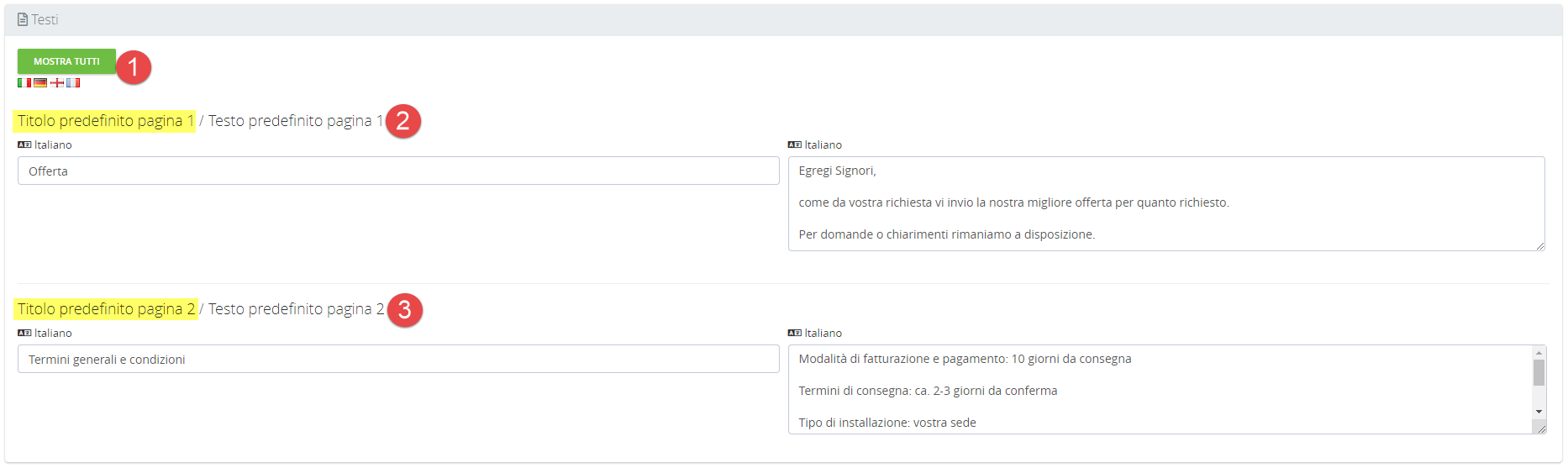 Da quest'area vengono inoltre impostati i testi globali presenti nelle Offerte: testo introduttivo e testo di chiusura > punti 8 e 10 in questa pagina.