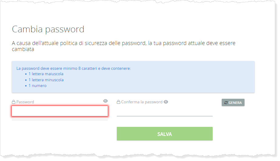 In caso di upgrade di versione da una precedente la 3.6.0, può capitare che la password di un utente non rispetti più gli standard minimi di sicurezza.