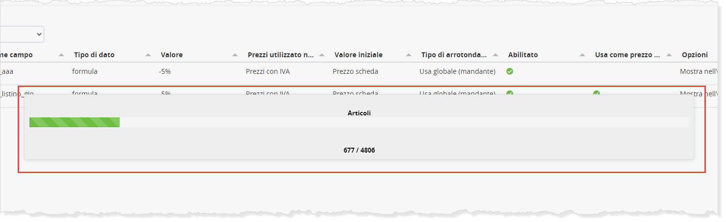 Se nel magazzino ci sono pochi articoli, il salvataggio è quasi istantaneo, mentre se ci sono migliaia di prodotti, TotalGest impiegherà un po' di più per impostare i nuovi prezzi e comparirà una barra di avanzamento: