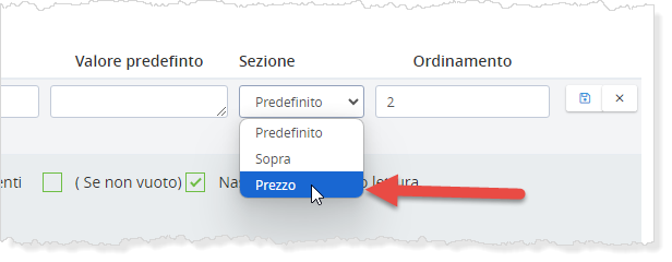 Questi campi personalizzati deveno necessariamente essere dei campi di tipo numero (cioè non testo) e nella colonna "Sezione" selezionare Prezzo