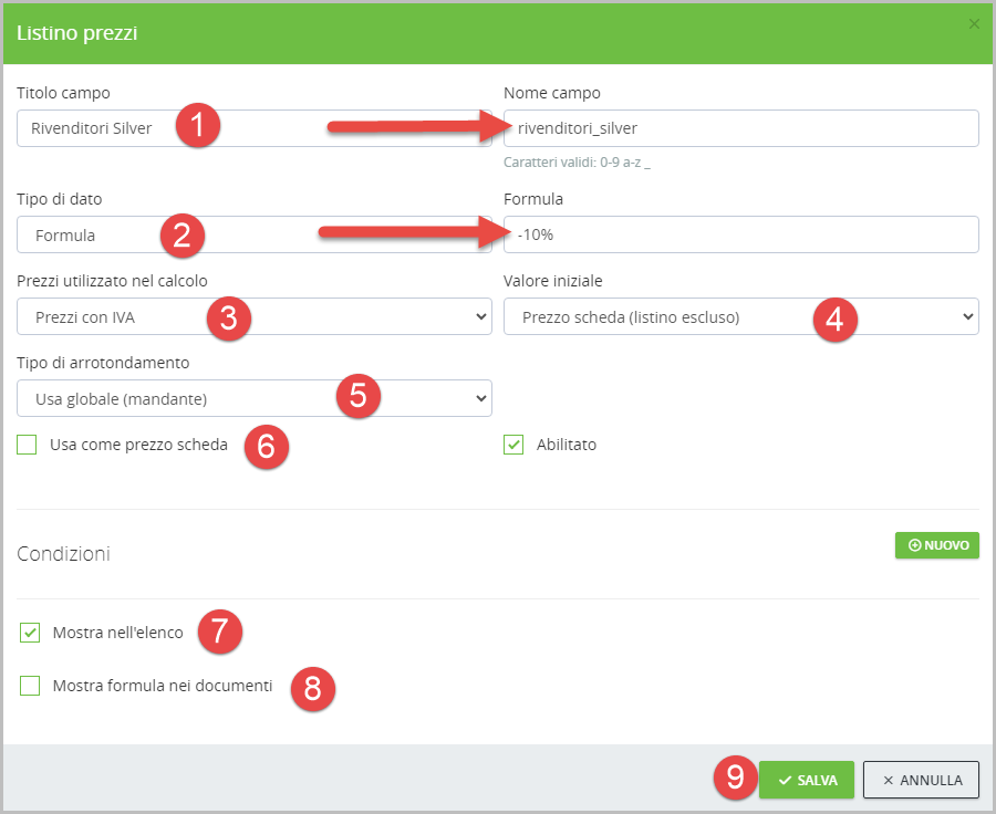 Quando viene salvato il listino una prima volta, poi si abilita la funzionalità delle Condizioni (conditional logic)