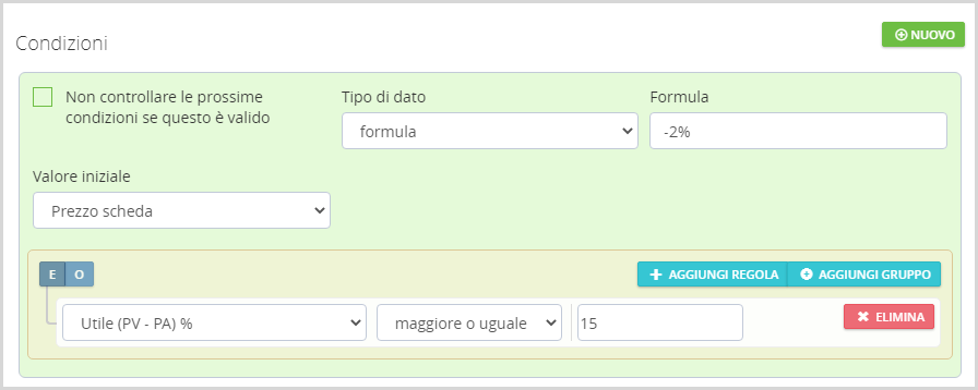 Un altro esempio può essere aggiungere uno sconto ulteriore del -2% a tutti quegli articoli per i quali abbiamo almeno il 15% di margine: