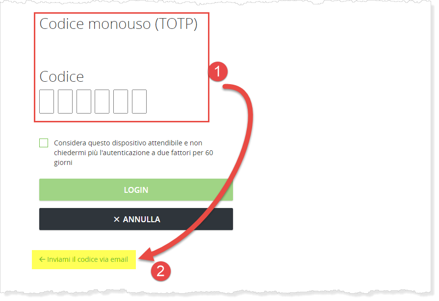 Se il codice su smartphone (1) non è possibile che venga usato, si può (2) cambiare con il codice via email.