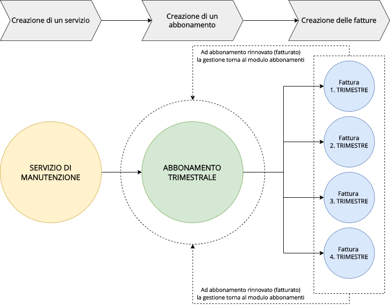 Di seguito una rappresentazione grafica sul funzionamento di questo modulo con, ad esempio, un abbonamento di manutenzione che viene fatturato ogni 3 mesi: