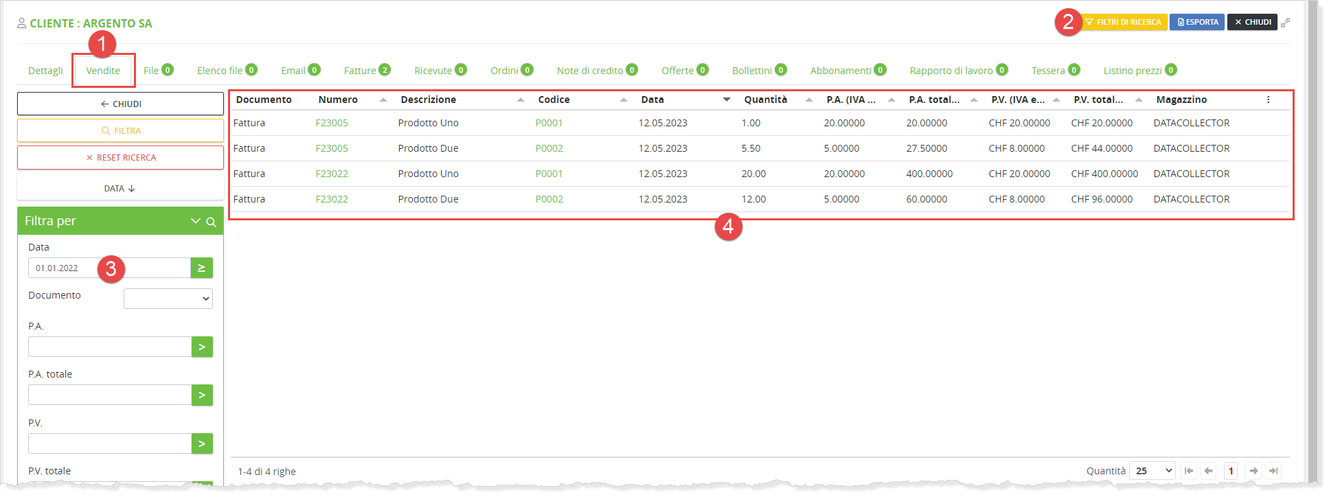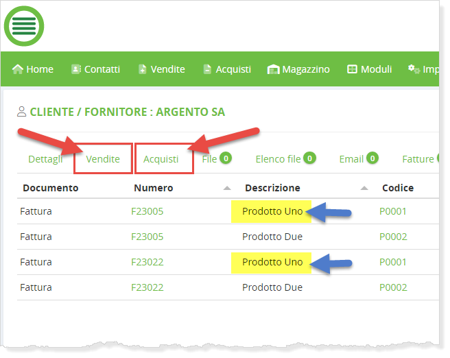 Da questi tab si possono vedere tutti gli articoli e servizi che sono stati venduti ad un cliente oppure acquistati da un fornitore.