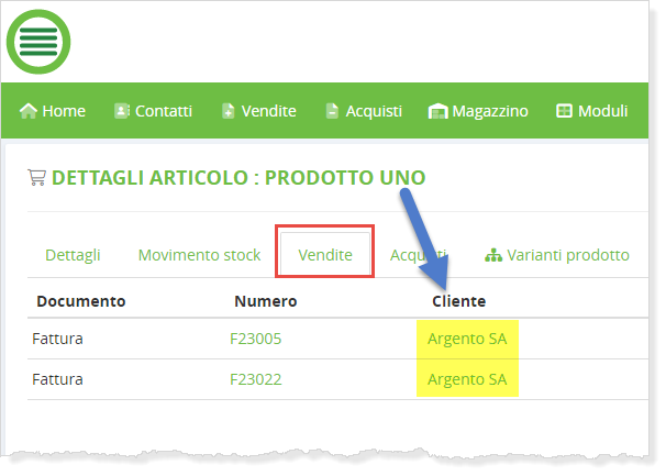 Dalla versione 3.6.0 sono stati introdotti dei nuovi tab Vendite / Acquisti presenti nelle schede di un contatto oppure nelle schede di un articolo / servizio.