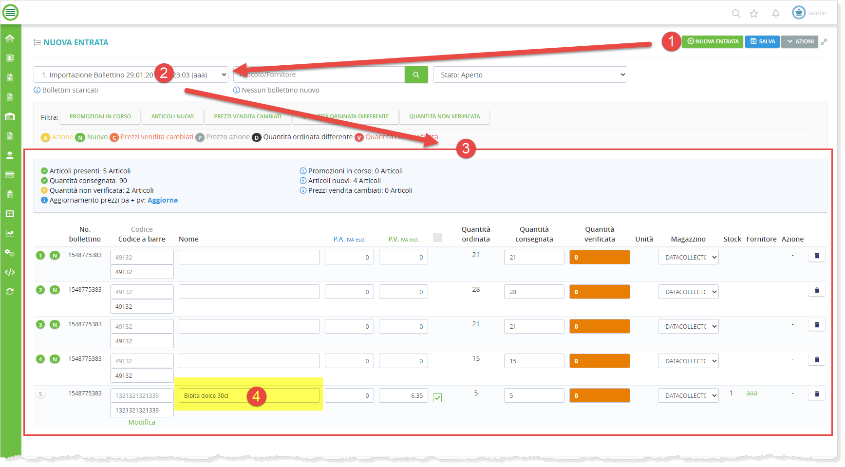 (3) Lista di articoli presenti nel file importato