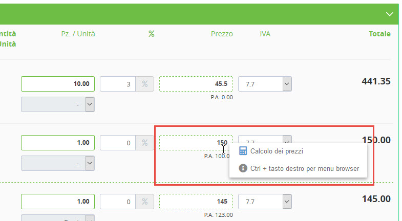 Il calcolatore dei prezzi viene attivato dal context menu (tasto destro del mouse sull'area tratteggiata) sulla casella dei prezzi (in fatture, ordini o offerte).