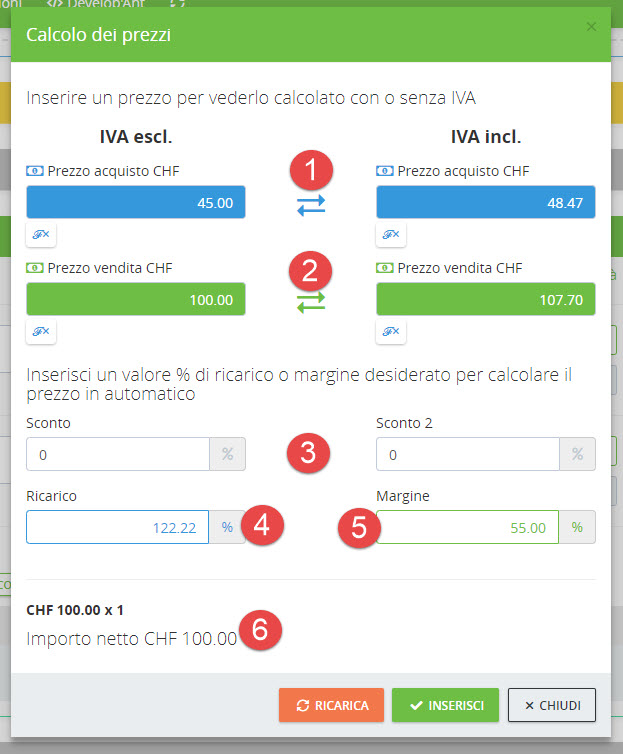 (4) Ricarico: se si modifica il valore %, in automatico si modifica il prezzo di vendita