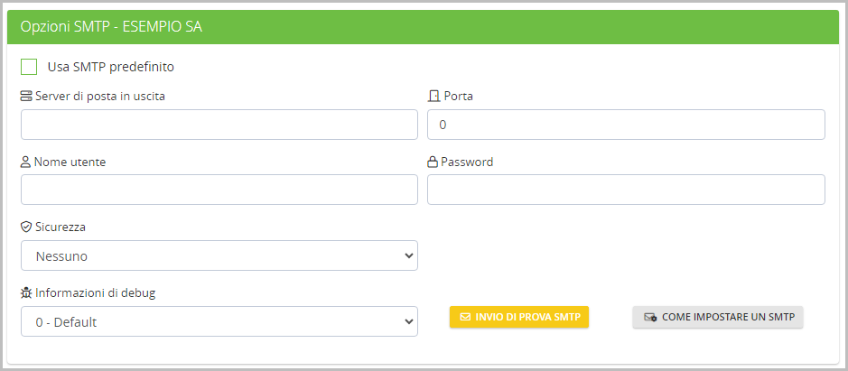 Esiste un SMTP predefinito globale a livello di installazione TotalGest: naturalmente questo è una configurazione che non va bene a tutti, quindi non è generalmente da usare, bensì si deve configurare un proprio SMTP.
