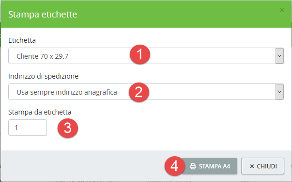 (3) Trattandosi di fogli A4 di etichette, con colonne e righe, si può scegliere da quale punto del foglio A4 iniziare a stampare
