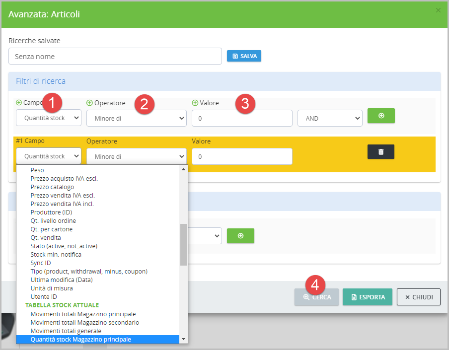 (1) Campo >> Tabella Stock Attuale >> Quantità stock Nome del Magazzino