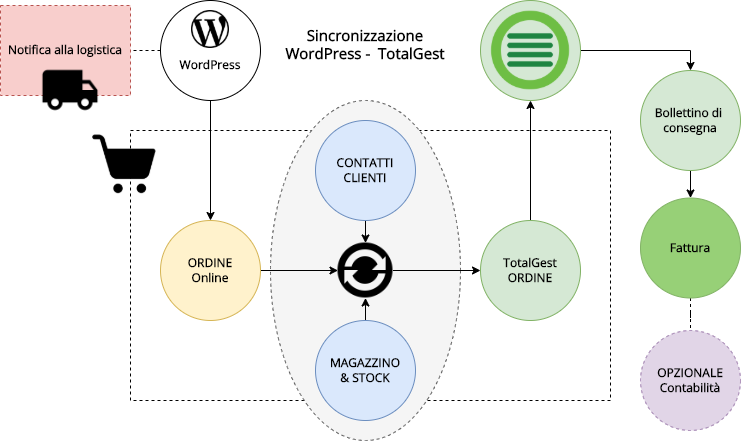 Dalla versione 3.3 di TotalGest è attivo e disponibile un connettore per comunicare con il plugin Woocommerce su WordPress.